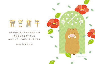 「猪と椿のレトロなデザイン」の年賀状には、文字ありと文字なしの2種類のご用意がありますので、是非シーンによって分けてご利用ください。