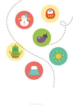 冬の季節やお正月に関係するモチーフをちりばめた年賀状デザインです!門松・だるま・富士山などのデフォルメされたイラストや、文字のデザインが少しレトロで優しい雰囲気ですね。