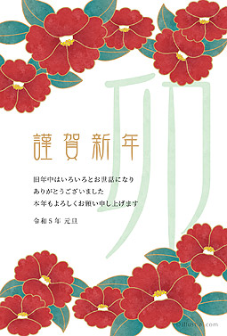 上下に置かれた鮮やかな赤い椿が、パッと目を引く華やかな印象の年賀状デザインです♪ 赤い椿のお花と、特徴的なフォントで書かれた「卯」のフォントの組み合わせが、とってもおしゃれですね。