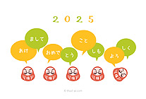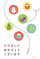 門松・だるま・富士山などのイラストや文字のデザインがレトロな雰囲気の年賀状。