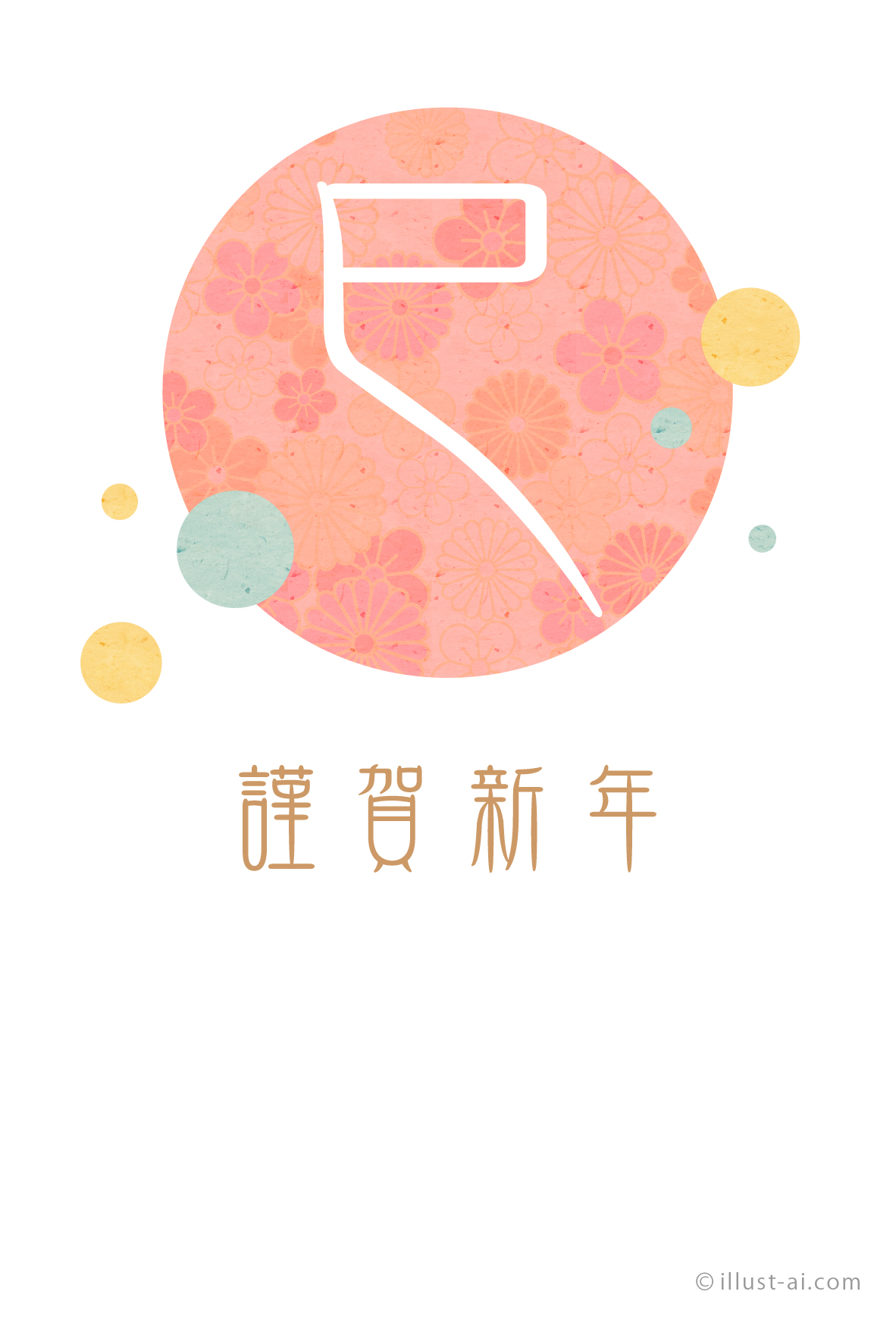シンプルだけれど、華やかな印象を受ける年賀状のデザインです♪ 中央の赤い円には、たくさんの和柄の花が詰まっていてとっても豪華ですね。