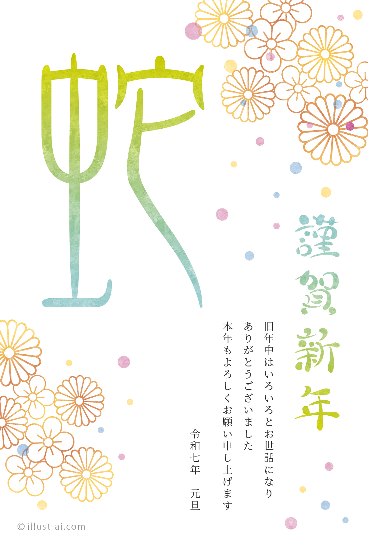 大きな「蛇」の文字がおしゃれで個性的!右側の「謹賀新年」の文字は、筆で丸く描いたようなデザインで、イラストの華やかな雰囲気にぴったり♪華やかで縁起のいいデザインなので、引越しや入籍の報告にもオススメです。