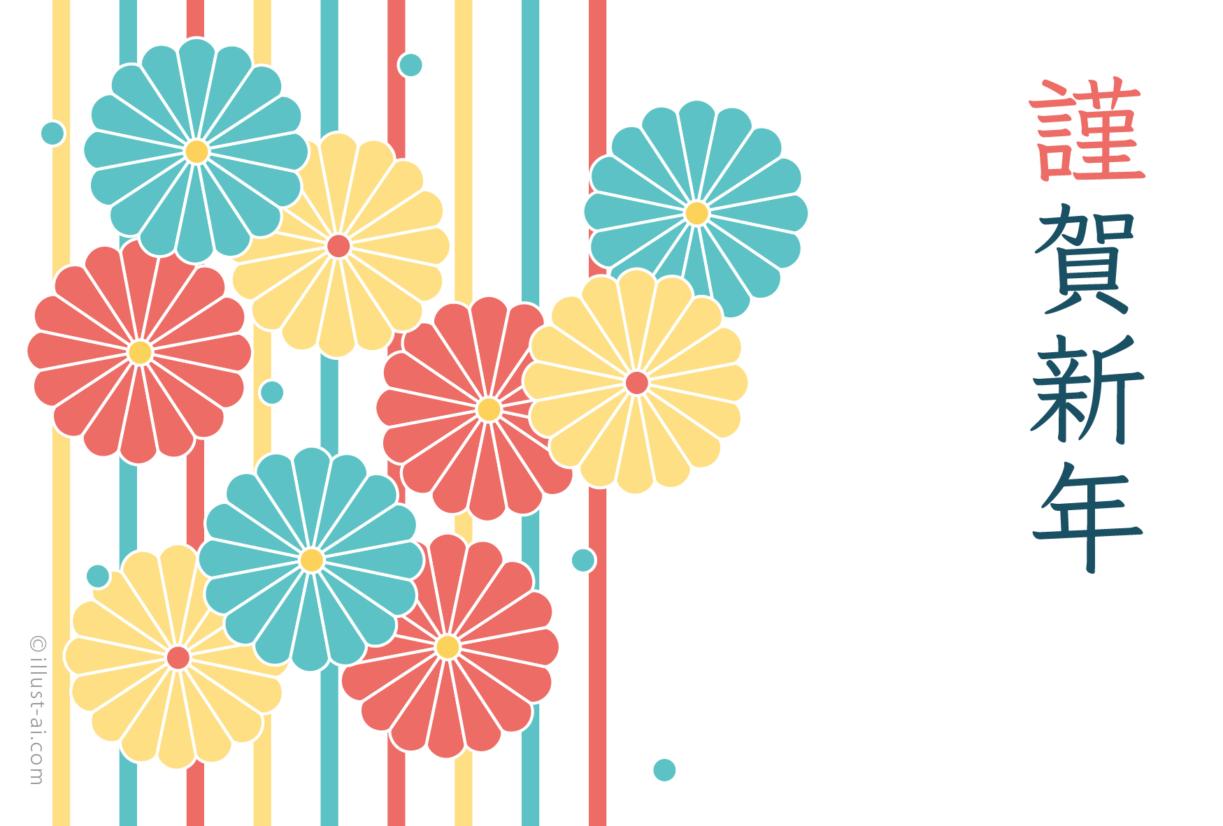 カラフルな菊達から受ける華やかな印象は、まるで着物の柄のようでお正月にピッタリですね♪ レトロなテイストの年賀状なので、若い方から大人の方まで使いやすいデザインです!お世話になっている人達へ年始の挨拶はいかがでしょうか?家族や友人・ビジネスのご挨拶にもどうぞ!挨拶が書いてあるので、印刷すればすぐに素敵な年賀状が作成できます。