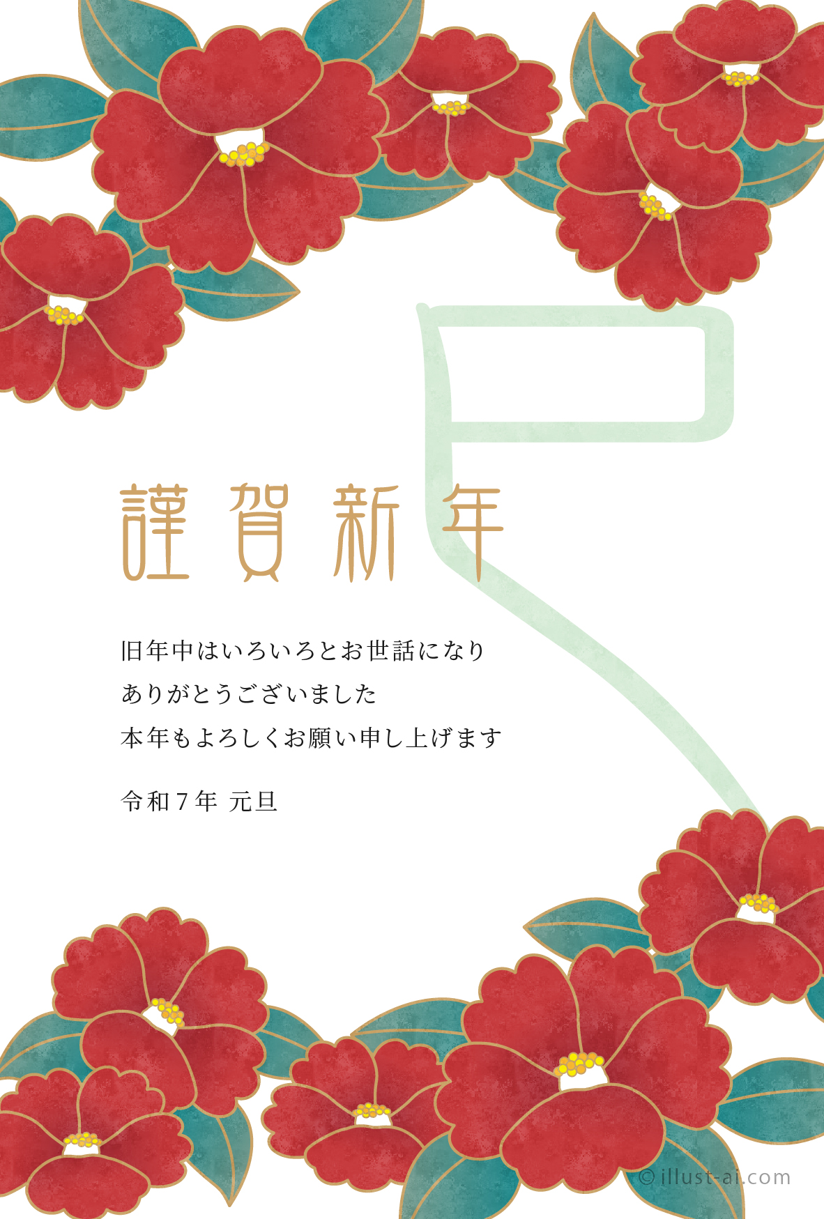 上下に置かれた鮮やかな赤い椿が、パッと目を引く華やかな印象の年賀状デザインです♪ 赤い椿のお花と、特徴的なフォントで書かれた「巳」のフォントの組み合わせが、とってもおしゃれですね。