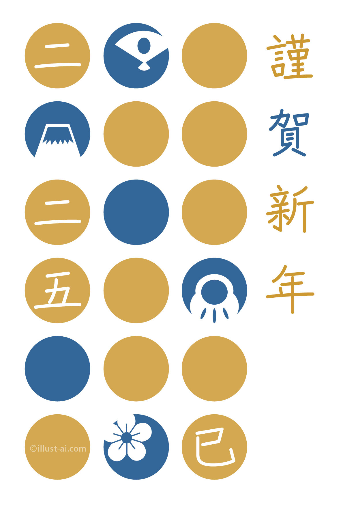 綺麗に3列に並んだドットの中に、富士山・扇・梅の花・だるまのシルエットイラストが描かれた年賀状です。