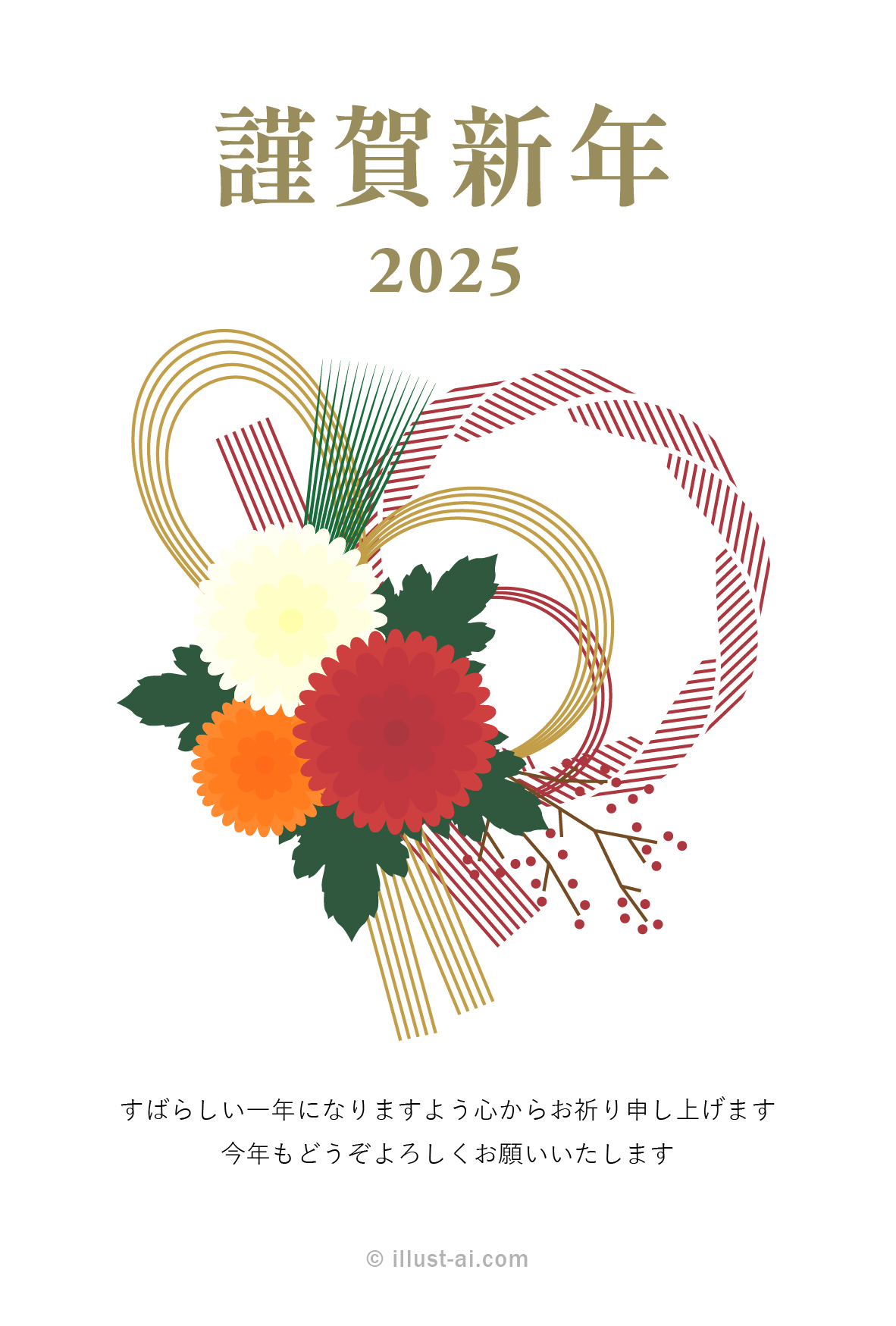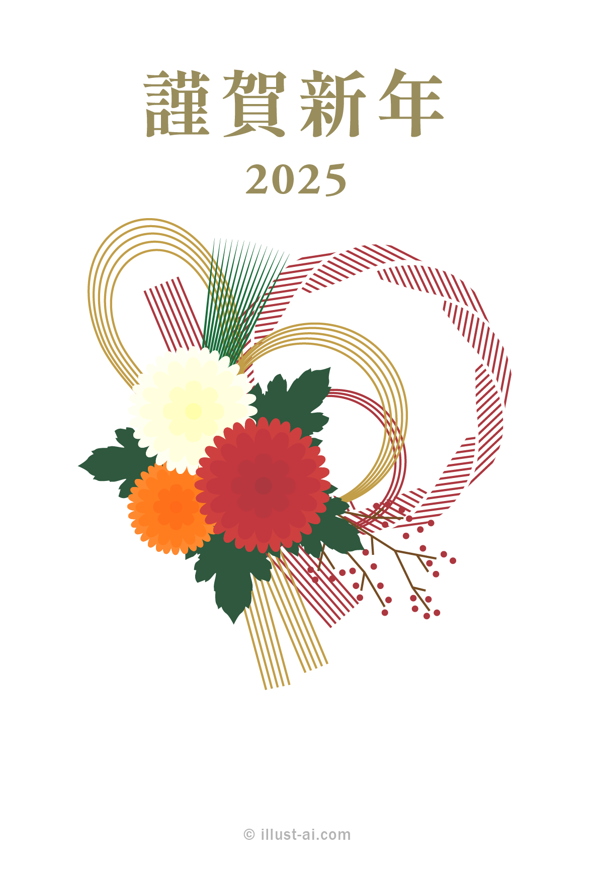赤い水引と菊の花で飾られた、しめ縄の年賀状イラスト。