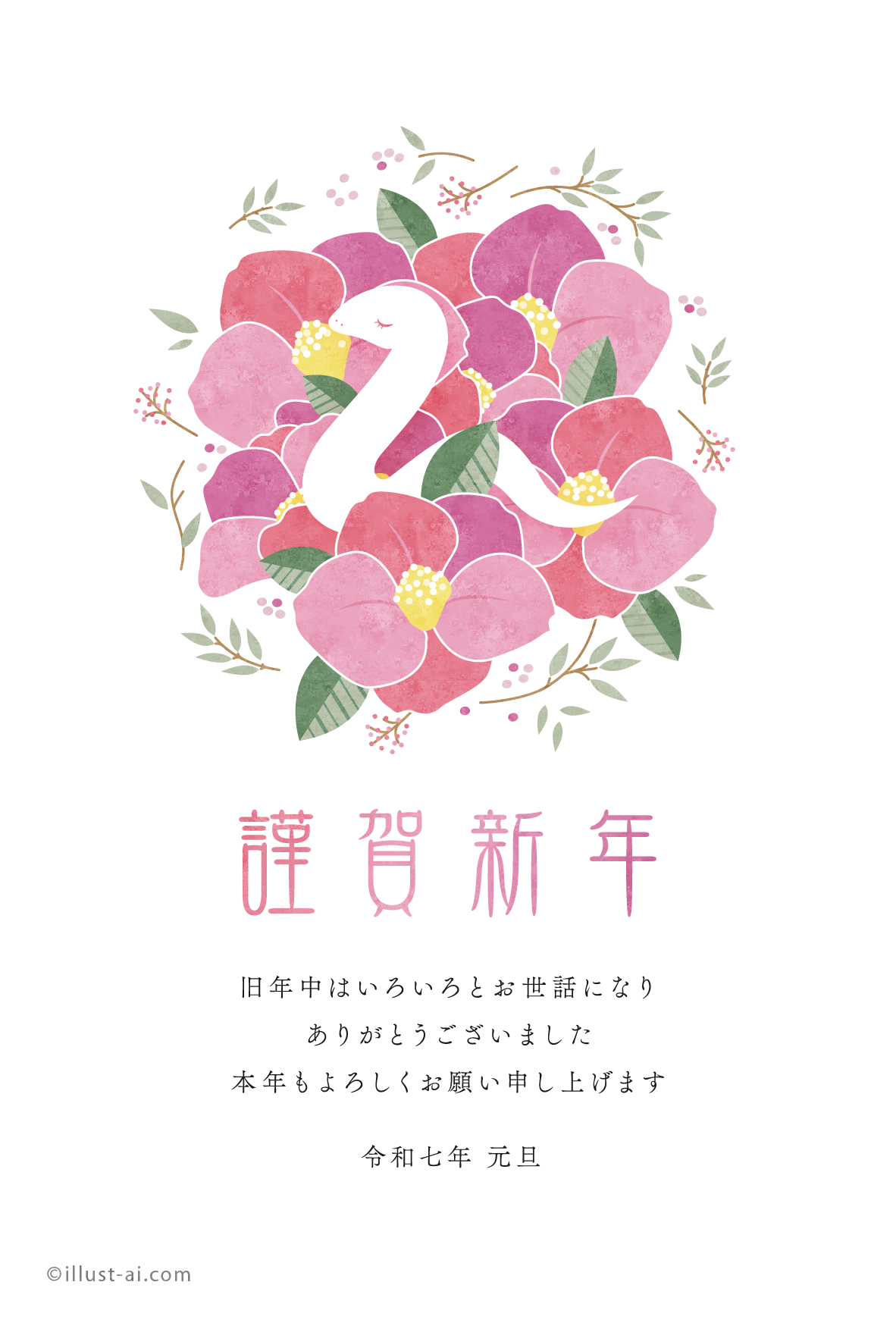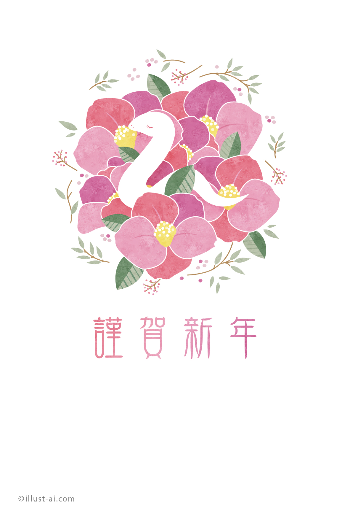 ナチュラル&シンプルなデザイン♪白い蛇と花々の年賀状(巳年)