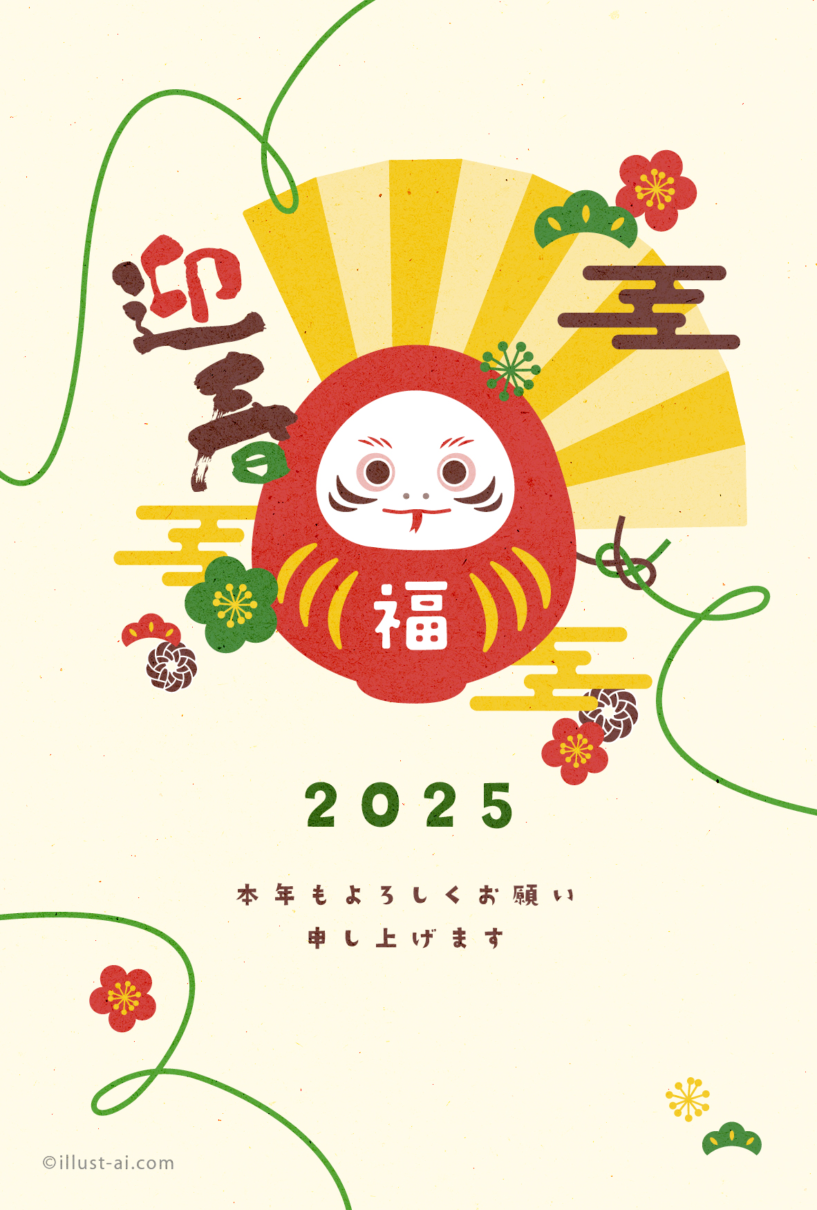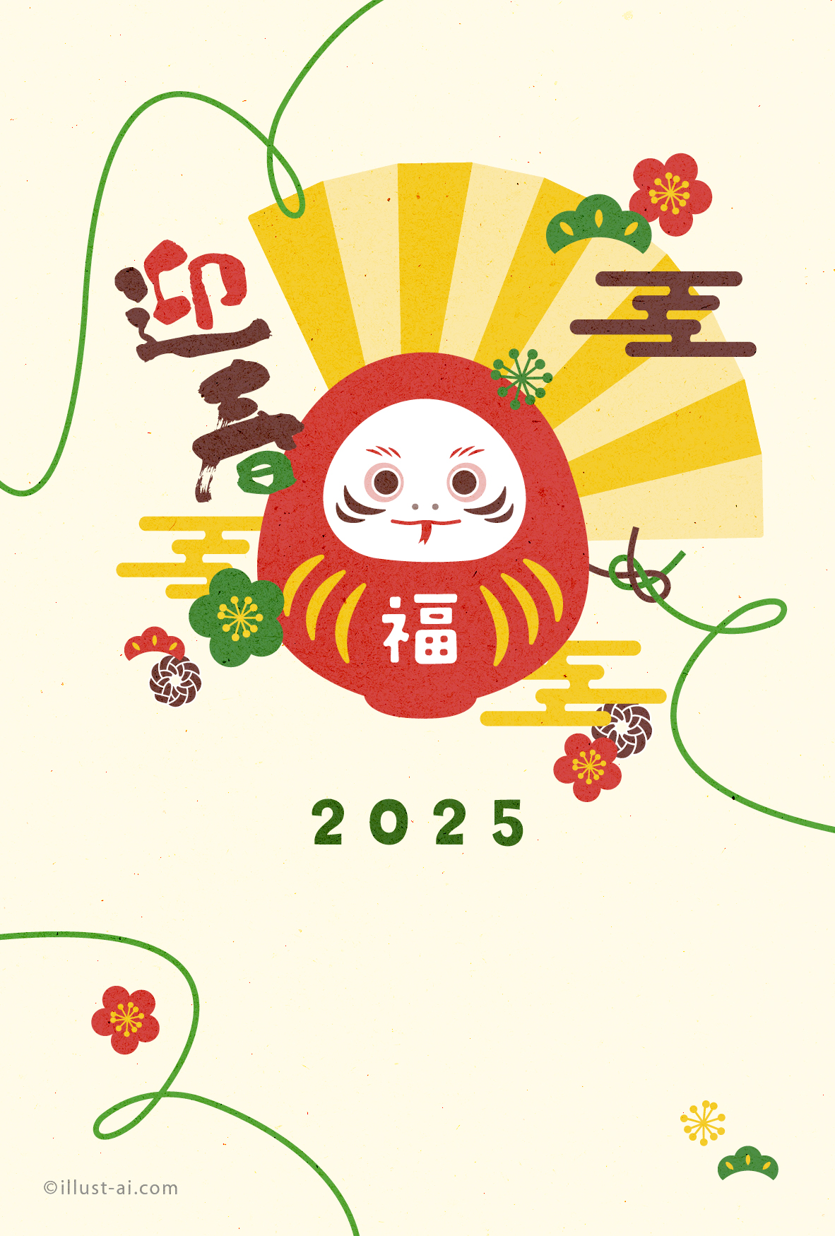 縁起がいいと言われている「だるま」と2025年の干支である「巳」をモチーフにしたイラスト年賀状です。