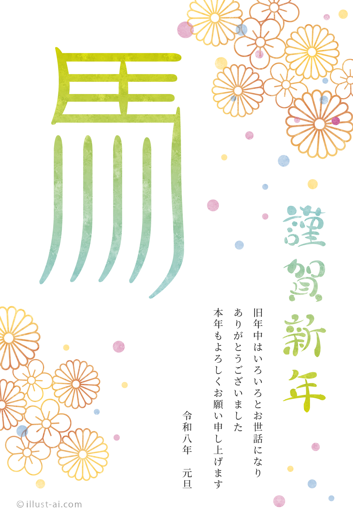 大きな「馬」の文字がおしゃれで個性的!右側の「謹賀新年」の文字は、筆で丸く描いたようなデザインで、イラストの華やかな雰囲気にぴったり♪華やかで縁起のいいデザインなので、引越しや入籍の報告にもオススメです。