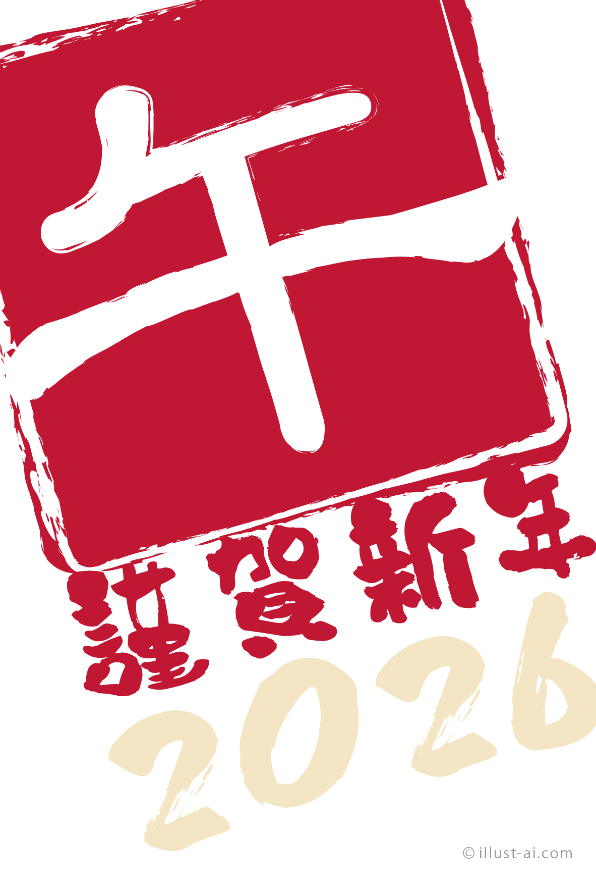 「午」の文字が描かれた判子を無造作に押したような、大胆なデザインが特徴の年賀状です。