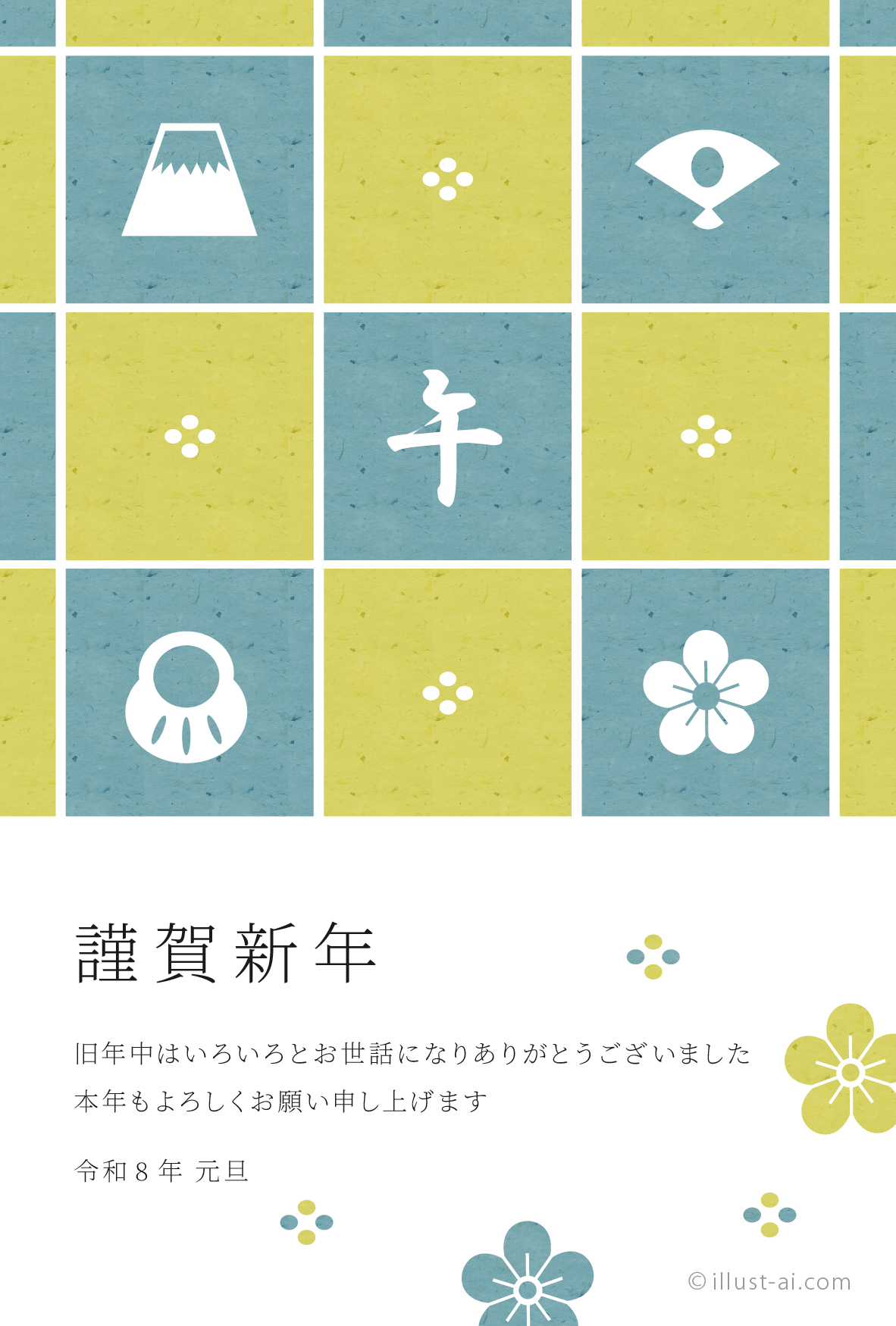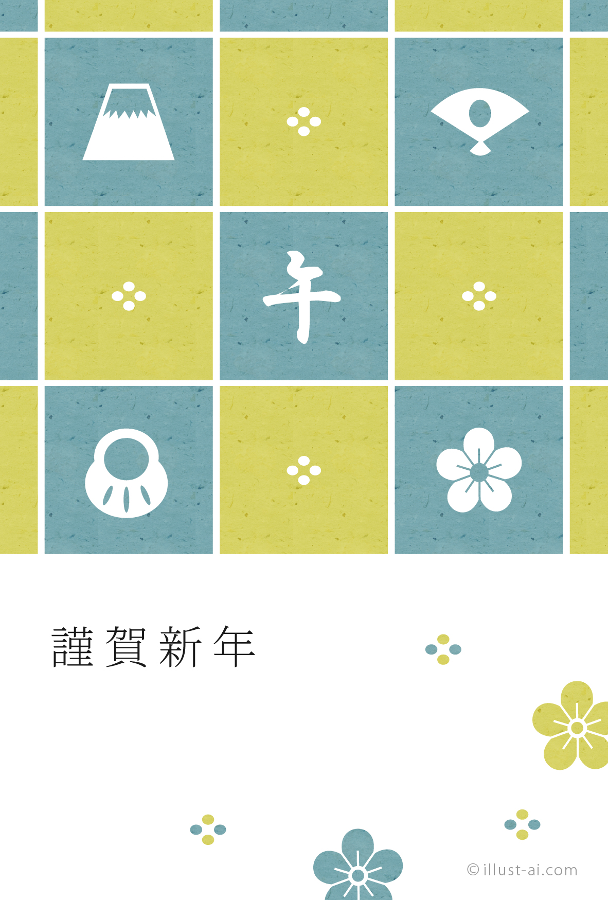 くすんだ黄緑と青の組み合わせが、渋くて落ち着いた印象ですね♪大人っぽい年賀状をお探しの方へおすすめです。