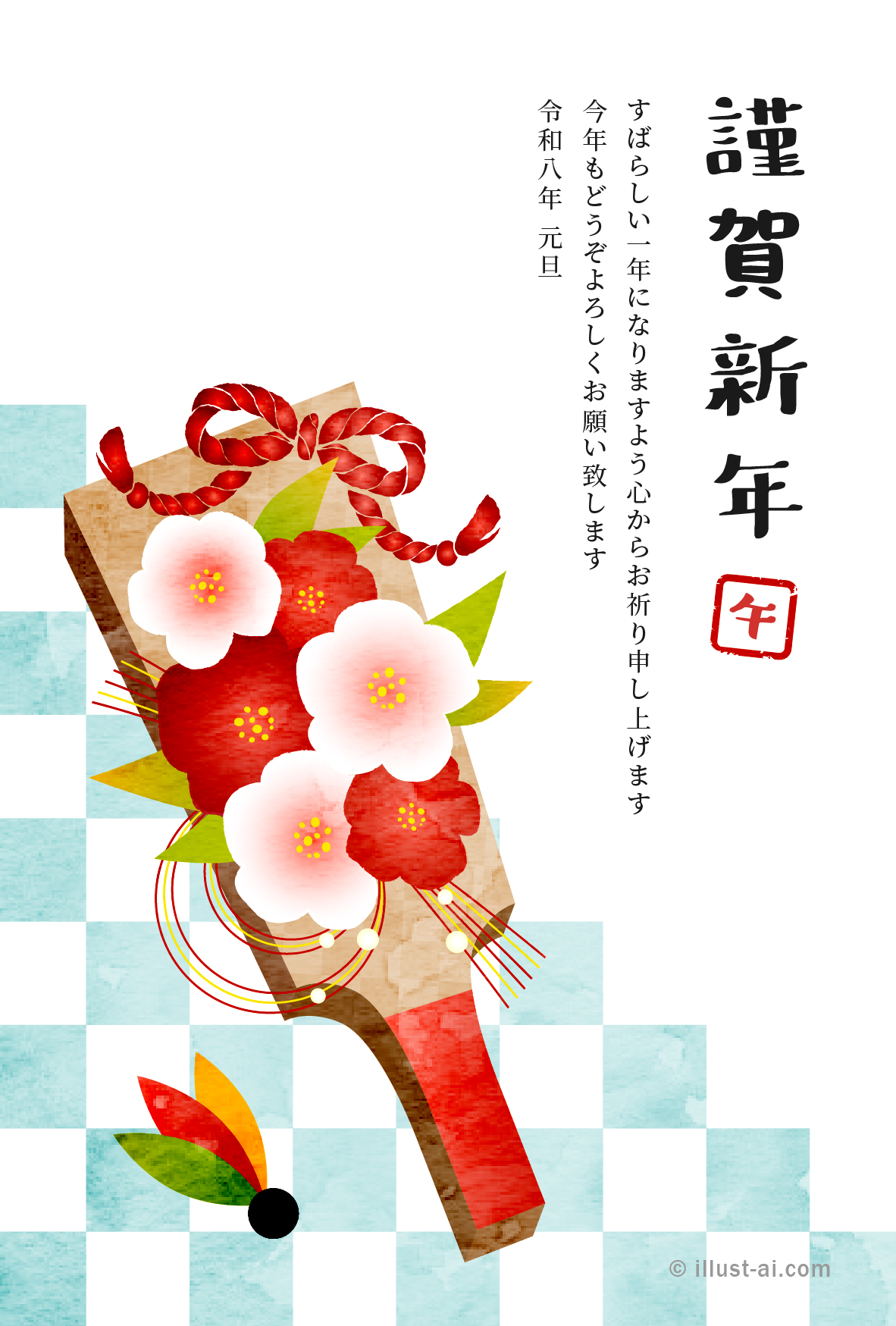 背景の市松模様が水色なので、赤を基調にした羽子板が映えるデザインです。