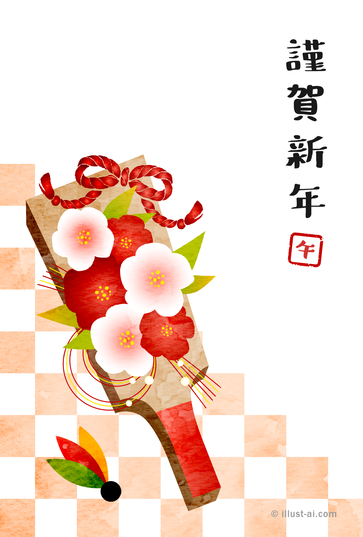 オレンジ色の市松模様と華やかな羽子板の年賀状(午年)