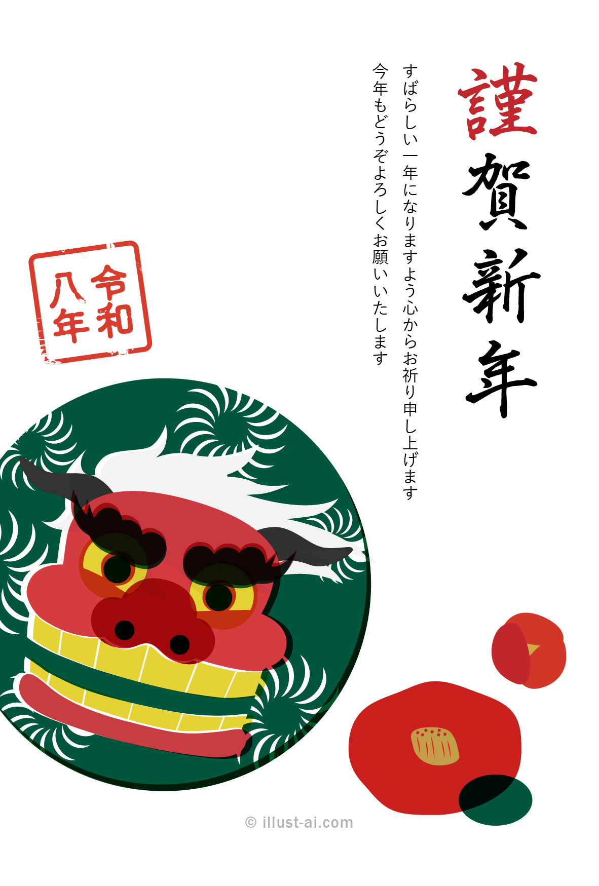 獅子舞と椿の花が描かれたシンプルな年賀状。