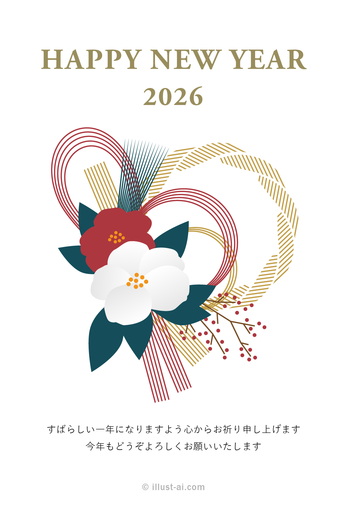 赤い水引と椿の花で飾られた、しめ縄の年賀状イラスト。